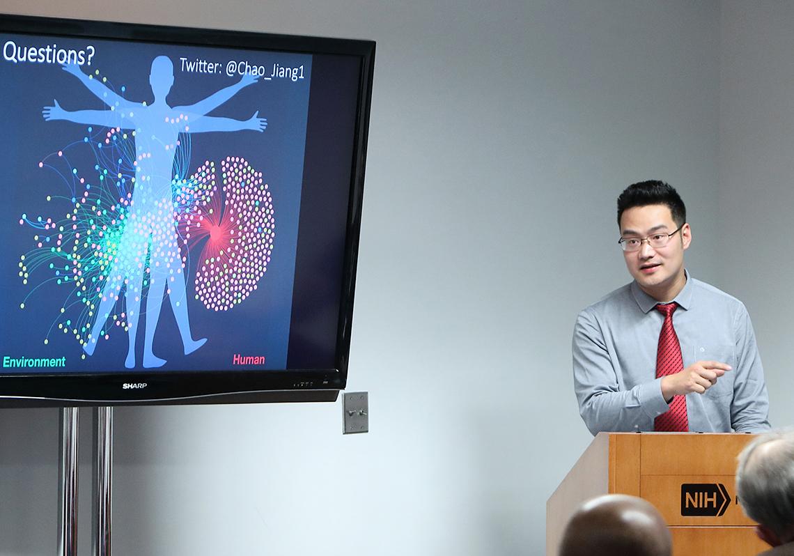 “Human health can be basically viewed as an interplaying product of genetics, lifestyle and environmental exposures,” Jiang explained in “Exposing the Human Exposome,” an NHGRI Faculty Search Seminar held recently in Bldg. 49. “Decades of research we have so far has given us a lot of information on genetics, genomics…[and even insights on aspects of lifestyle, such as stress and diet]. However, comparatively speaking, we know very little about environmental exposures…the exposome is not well understood and poorly studied…so we wanted to know, could we track and quantify personal environmental exposures?”