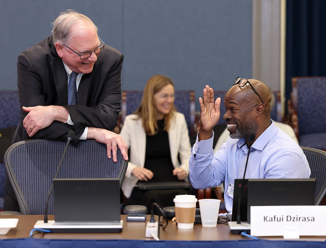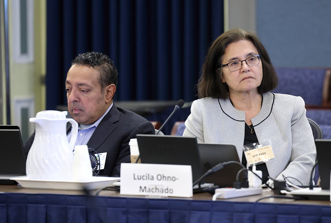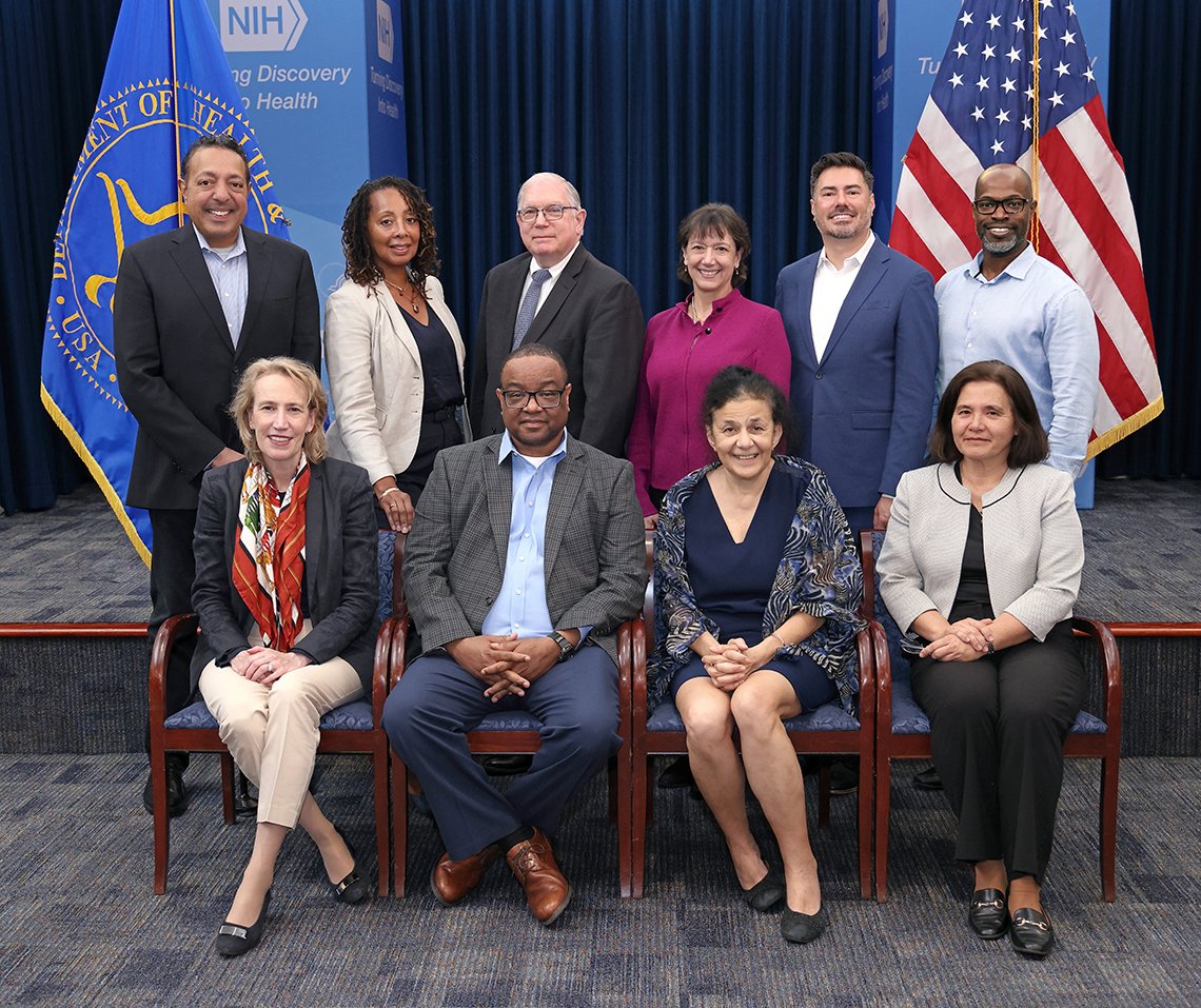 The 128th meeting of the ACD was convened hybrid style. Attending on site were (standing, from l) Dr. Atul Butte of the University of California-San Francisco; Corbie; Tabak; Bertagnolli; Mustanski; Dzirasa; (seated, from l) Dr. Alexa Kimball of Harvard; Dr. Corey Moore of Langston University; Dr. Wafaa El-Sadr of Columbia University Mailman School of Public Health; and Dr. Lucila Ohno-Machado of Yale School of Medicine.