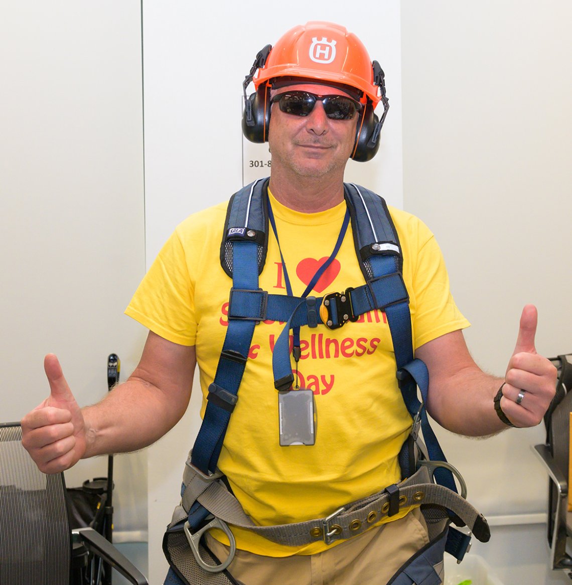 Man in bright yellow Wellness Day shirt, sunglasses, headphones, safety harness gives thumbs up.